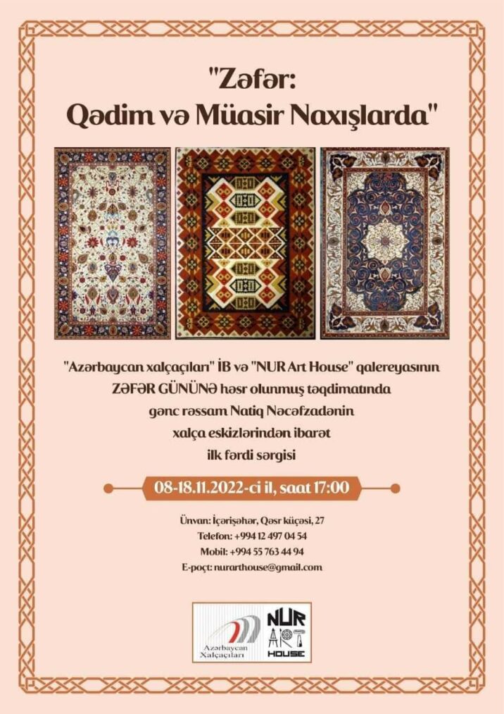Müstəqil.az xəbər verir ki , gənc rəssam Natiq Nəcəfzadənin “Azərbaycan xalçaçıları” İctimai Birliyi və “NUR Art House” qalereyasının birgə dəstəyi ilə ZƏFƏR GÜNÜNƏ həsr olunmuş “Zəfər: Qədim və Müasir Naxışlarda” adlı xalça eskizlərindən ibarət ilk fərdi sərgisi keçiriləcək.