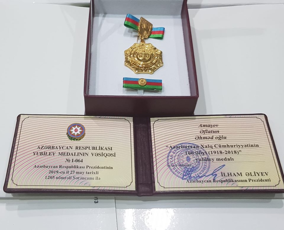 Azərbaycan Xalq Cümhuriyyətinin 100 illiyi (1918-2018)” yubiley medalı ilə təltif olunduğum üçün Azərbaycan Respublikasının Prezindenti cənab İlham Əliyevə dərin təşəkkürümü bildirirəm.