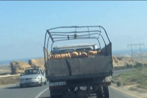 Üstü açıq yük avtomobilində natəmiz vəziyyətdə daşınır. İddia olunur ki, bu çörəklər satılması üçün mağazalara aparılır.