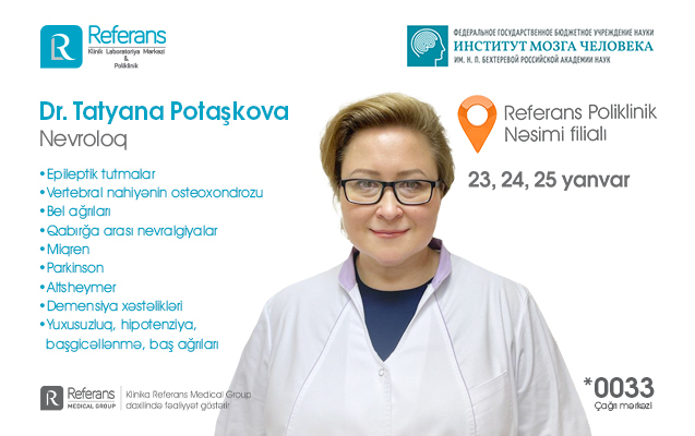 “Qafqazinfo” xəbər verir ki, Sankt-Peteburqun dünyaca məşhur «Институт мозга человека им. Н.П.Бехтеревой» -dan dəvətli Nevroloq Dr. Tatyana Potaşkova və Uşaq Nevroloqu T.E.N Dr. İrina İvaşenko 23, 24 və 25 yanvar tarixlərində Bakıda, Referans Poliklinik Nəsimi filialında hər növ nevroloji şikayətlərdən əziyyət çəkən pasiyentləri qəbul edəcəklər.
