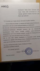 “Şahdağ” gəmisinin heyəti Ali Baş Komandana müraciət etdi