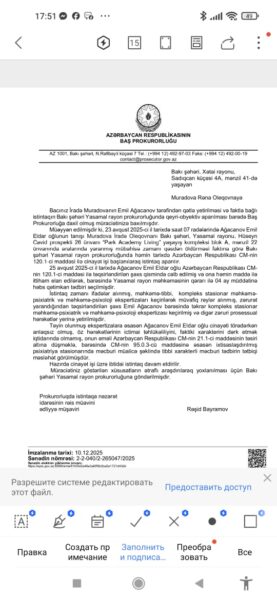 Azərbaycan Respublikasının Baş Prokurorluğu zərərçəkmişə məktub yazıb:
