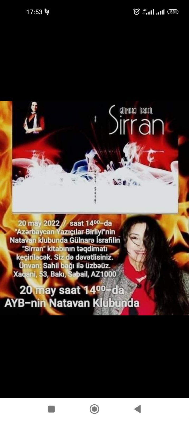Posted in Ədəbiyyat, Xəbər Xətti Gülnarə İsrafil “Sirran”ı təqdim edəcək… Müstəqil AZ 17:59 / 19 May 2022