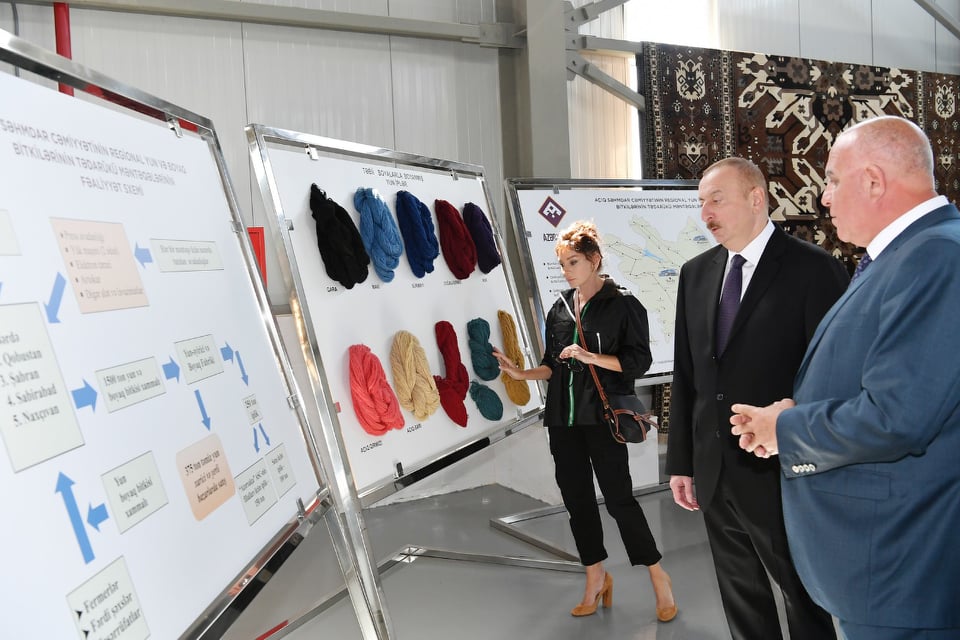 Daha sonra Prezident İlham Əliyev və birinci xanım Mehriban Əliyeva “Azərxalça” Açıq Səhmdar Cəmiyyətinin Qobustan regional yun və boyaq bitkilərinin tədarükü məntəqəsinin fəaliyyəti ilə tanış oldular.