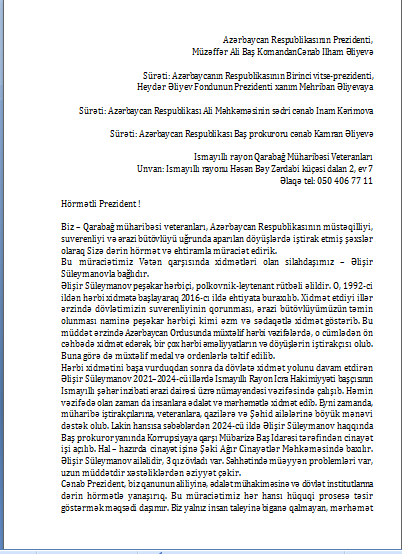 Veteranların müraciətində vurğulanır ki, 2024-cü ildə Əlişir Süleymanov barəsində Baş Prokuror yanında Korrupsiyaya qarşı Mübarizə Baş İdarəsi tərəfindən cinayət işi açılıb və hazırda işə Şəki Ağır Cinayətlər Məhkəməsində baxılır.