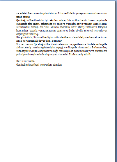 Qarabağ müharibəsi veteranları bildiriblər ki, müraciət hər hansı hüquqi prosesə təsir göstərmək məqsədi daşımır. Onlar qanunun aliliyinə və məhkəmələrin müstəqilliyinə hörmət etdiklərini qeyd edərək, məsələyə humanizm və mərhəmət prinsipləri çərçivəsində diqqət yetirilməsini xahiş ediblər.