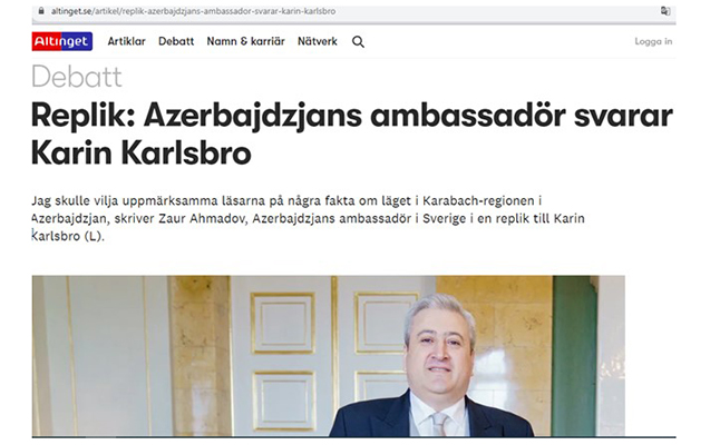 “Altinget” qəzetindəki müsahibəsində Zaur Əhmədov Azərbaycanın 19 sentyabrda atdığı addımların beynəlxalq hüquqa əsaslandığını vurğulayıb (https://www.altinget.se/artikel/replik-azerbajdzjans-ambassador-svarar-karin-karlsbro)