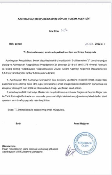 Uzun illərdir ki, Azərbaycan mətbəxini dünyaya tanıtdırmağa səy göstərir. Beynəlxalq yarışlarda milli mətbəximizi yüksək səviyyədə təqdim etməyi bacarır. Bu istiqamətdə hər dəfə yeni-yeni uğurlara nail də olur. Amma nədənsə ona qarşı gizli bir mübarizə gedir. Dəstək vermək əvəzinə, onu sıradan çıxarmağa, işinə mane olmağa çalışırlar. Ötən il ezamiyyətdə olarkən, 64 yaşı olmasına baxmayaraq, yəni təqaüd yaşına bir il qalmış, onu tutduğu vəzifədən çıxardılar. Bir ağıllı adam tapılıb demədi ki, ölkədə 65 yaşından yuxarı o qədər işləyənlər var ki… Məsələn, elə AMEA-da çalışan akademikləri götürək. Məgər Tahir Əmiraslanov o akedemiklərdən ölkəyə azmı mənfəət gətirir, ölkəni azmı tanıtdırır? Əsla yox! Əksinə, Azərbaycan mətbəxini dünyada təbliğ edir, mübahisəli xörəklərimizə sahib çıxır, Azərbaycana aid olduğunu dünyaya sübut edir. İş o yerə çatıb ki, o, vəzifədən uzaqlaşdırılandan sonra Azərbaycan Milli Klinariya Mərkəzi irəli yox, xeyli geriyə gedib. Məsələn, 2022-ci ilin sonunda erməni nümayəndə heyəti, son 30 ildə ilk dəfə olaraq, Lüksenburqda keçirilən yarışlarda qızıl medala yox, medallara layiq görülüblər. Aşağıda təqdim etdiyim üç sənəddən biri onun işdən uzaqlaşdırılması barədədir. Görün bu sənədə imza atanda insaf varmı?..