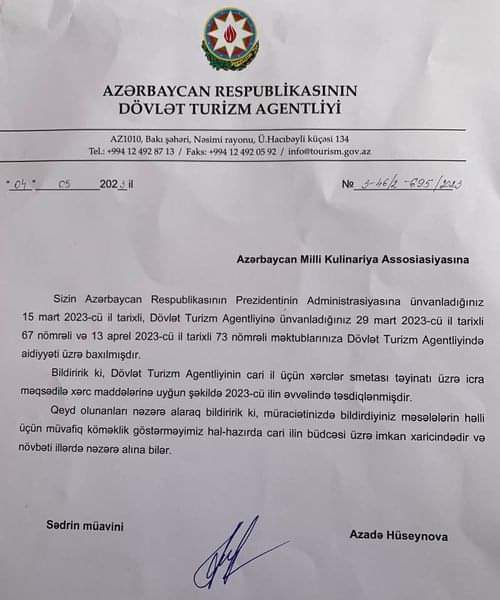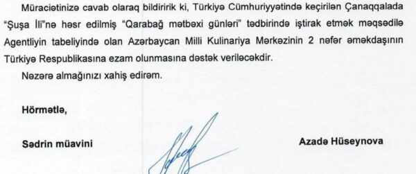 Azada xanımdan cavab gəlir ki;- “Müraciətinizə cavab olaraq bildiririk ki, Türkiyə Cümhuriyyətində keçirilən Çanaxqalada “Şuşa İli”nə həsr edilmiş “Qarabağ mətbəxi günləri” tədbirində iştirak etmək məqsədilə Agentliyin tabeliyində olan Azərbaycan Milli Kulinariya Mərkəzinin 2 nəfər əməkdaşının Türkiyə Respublikasına ezam olunmasına dəstək veriləcəkdir. Nəzərə almağınızı xahiş edirəm.”