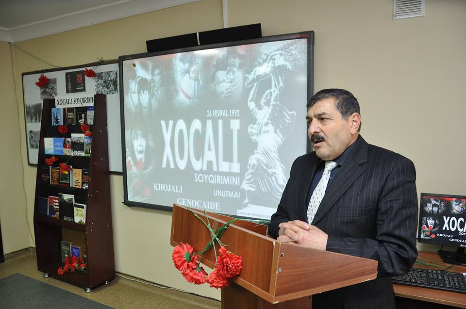 Müstəqil.Az bildirir ki,Lənkəran Dövlət Universitetində (LDU) Azərbaycan xalqının başına gətirilən ən dəhşətli faciələrdən biri olan Xocalı soyqırımının 27-ci ildönümü ilə bağlı silsilə tədbirlər keçirilib.Bu gün universitetdə bütün fakültələrdə ilk dərslər Xocalı faciəsinə, soyqırım qurbanlarının xatirəsinə həsr edilib. Universitetin kitabxanasında faciənin dəhşətlərindən bəhs edən kitab, məcmuə, braşura, qəzet, foto-şəkillərdən ibarət sərgi təşkil olunub.