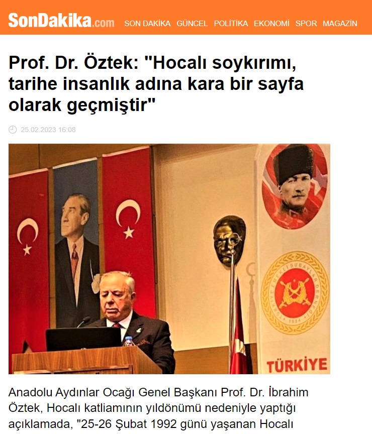 Türkiyənin Anadolu agentliyində yayımlanan “İnsanlıq tarixinin qara ləkəsi: Xocalı soyqırımı” sərlövhəli məqalədə bildirilib ki, Azərbaycan xalqı erməni hərbi birləşmələrinin 1992-ci il fevralın 26-da Xocalıda qadın, uşaq və qoca demədən törətdiyi qətliamın qurbanlarının xatirəsini yad edir. Faciəsi ilə bağlı faktların təqdim olunduğu məqalədə vurğulanıb: “Xocalı soyqırımından 31 il ötür, ancaq faciənin kədəri bu gün də azərbaycanlıların qəlbini göynədir. Azərbaycan xalqı Ordusunun 2020-ci ildə 44 günlük İkinci Qarabağ müharibəsində qazandığı Zəfərdən sonra artıq üç ildir ki, şəhidlərinin xatirəsini qalib xalq kimi anırlar. İnsanlıq tarixinə qara ləkə kimi yazılan bu soyqırımı heç vaxt unudulmasa da, işğal altındakı torpaqların azad edilməsi Azərbaycan xalqı üçün təsəlli oldu. İndi azərbaycanlıların yeganə istəyi Xocalı qətliamını törədənlərin mühakimə olunması və ədalətin təmin edilməsidir”.
