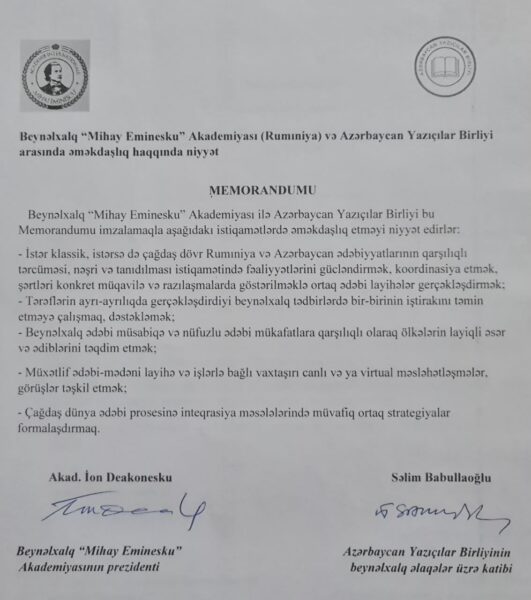 tərcüməsi, nəşri və tanıdılması istiqamətində fəaliyyətlərini gücləndirmək, koordinasiya etmək, ortaq ədəbi layihələr gerçəkləşdirmək, beynəlxalq tədbirlərdə bir-birinin iştirakını təmin etmək, dəstəkləmək, beynəlxalq ədəbi müsabiqə və nüfuzlu ədəbi mükafatlara qarşılıqlı olaraq ölkələrin layiqli əsər və ədiblərini təqdim etmək, çağdaş dünya ədəbi prosesinə inteqrasiya məsələlərində müvafiq ortaq strategiyalar formalaşdırmaq kimi vacib məsələləri əhatə edən sənəd 2 dildə-Azərbaycan və rumın dillərində akademiyanın prezidenti, akad. İon Deakonesku və Birliyin beynəlxalq əlaqələr üzrə katibi Səlim Babullaoğlu tərəfindən imzanlanıb.